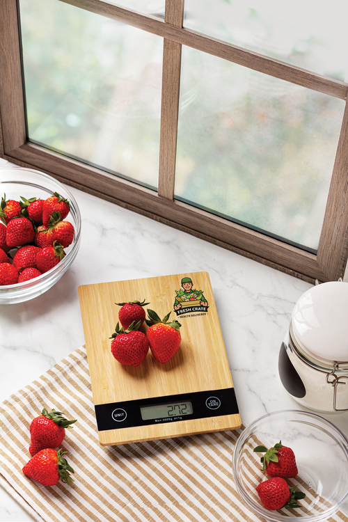 Perfect for healthy eating programs, this bamboo kitchen scale measures both wet and dry ingredients up to 11 lbs.
