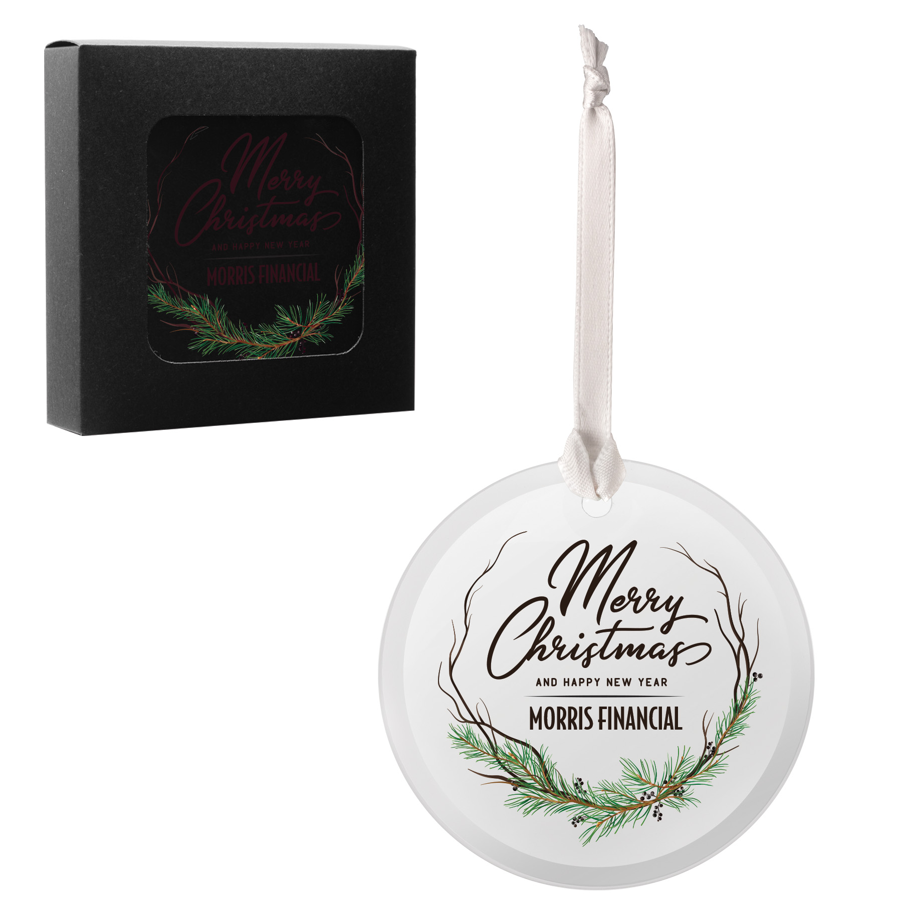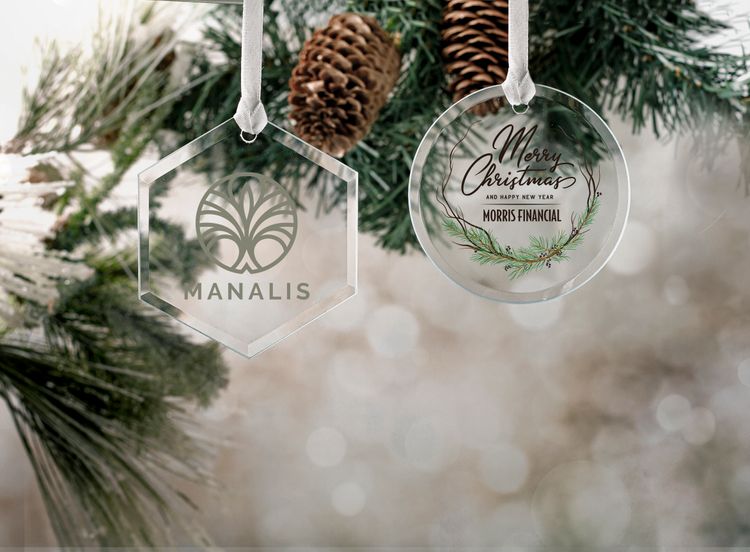 Available in two distinctive beveled glass shapes—circle and hexagon—each ornament adds a touch of modern sophistication to any holiday decor or promotional gift