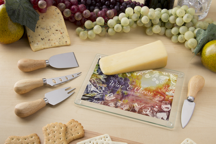 This complete set includes a tempered glass cutting board with non-slip feet and 4 stainless steel cheese knives featuring wood handles. Pricing includes Colorfy full color decorating on the glass cutting board. To keep clean simply hand wash with warm soapy water.
