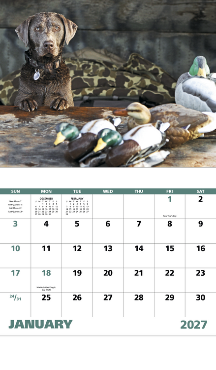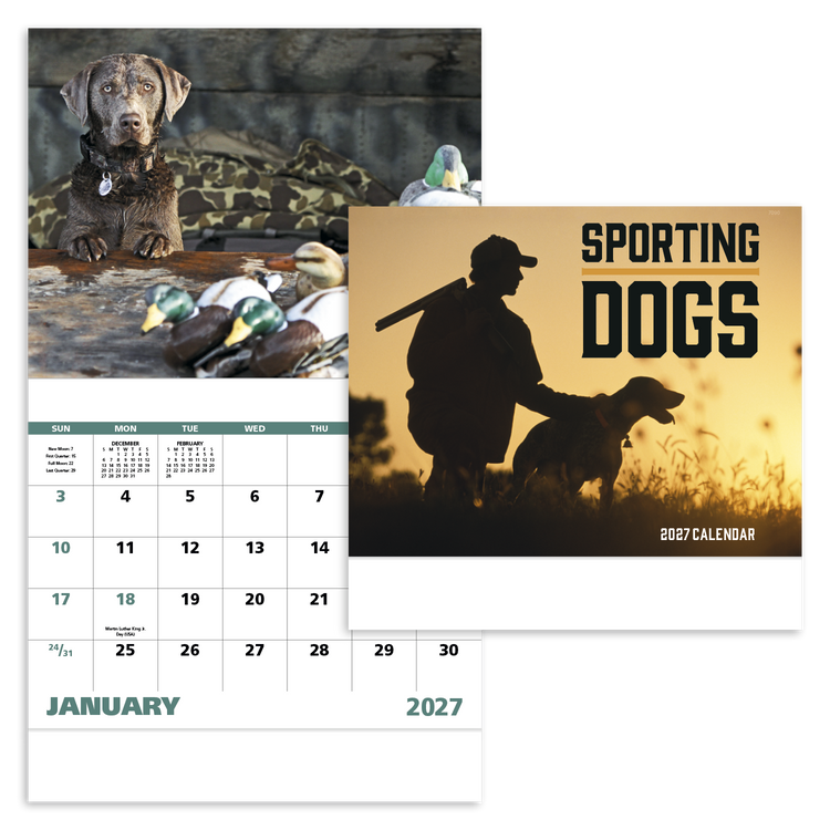 This 13-month calendar captures the adventure, energy, and loyalty that sporting dogs represent. Perfect for dog lovers and outdoor enthusiasts, it brings the charm of these beloved breeds into your everyday life. Additional decoration charges may apply.