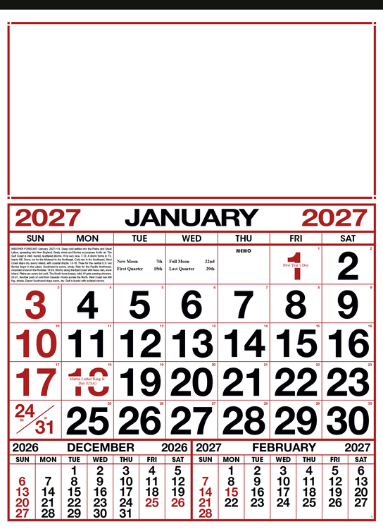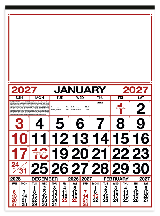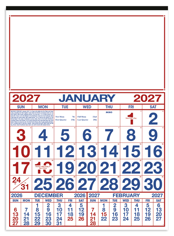 Keep track of the date at a glance with this large-format 12-sheet commercial calendar. The bold numbers and clear layout make it easy to stay organized, while the previous and upcoming months provide convenient reference. The SFI® label means that materials used for this product have been responsibly sourced. Additional decoration charges may apply.