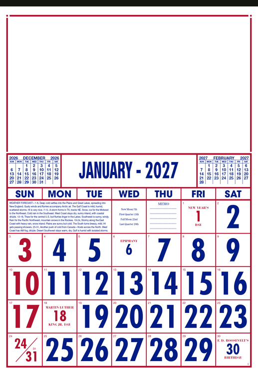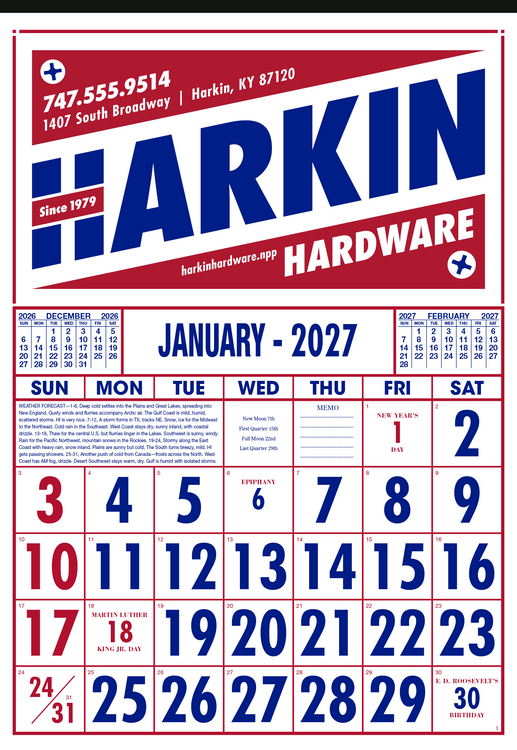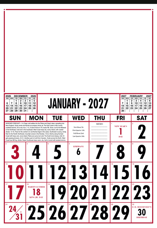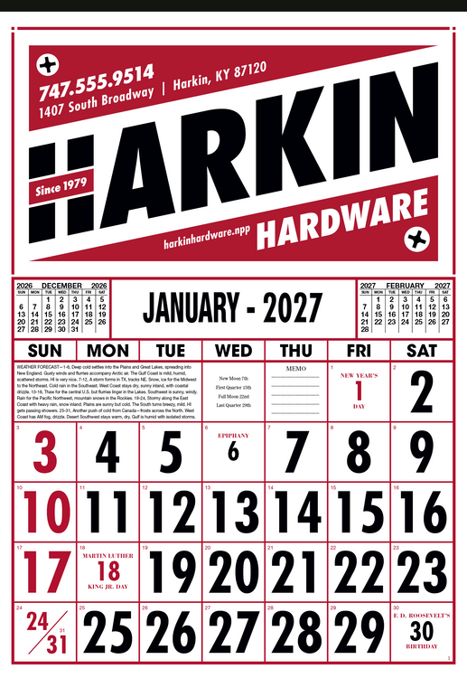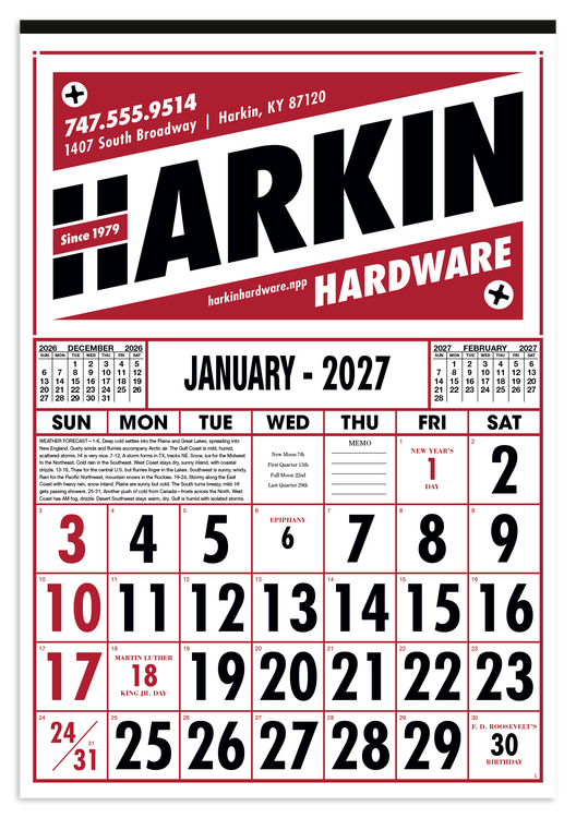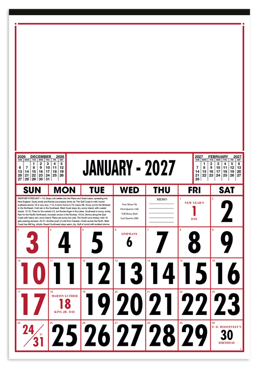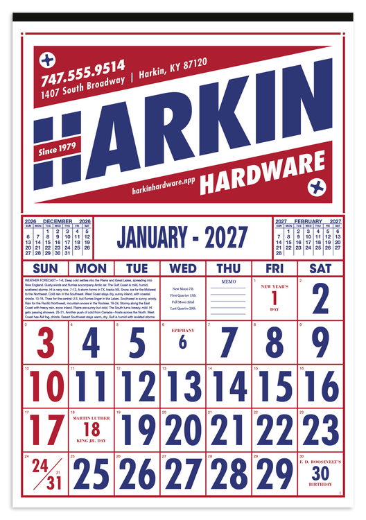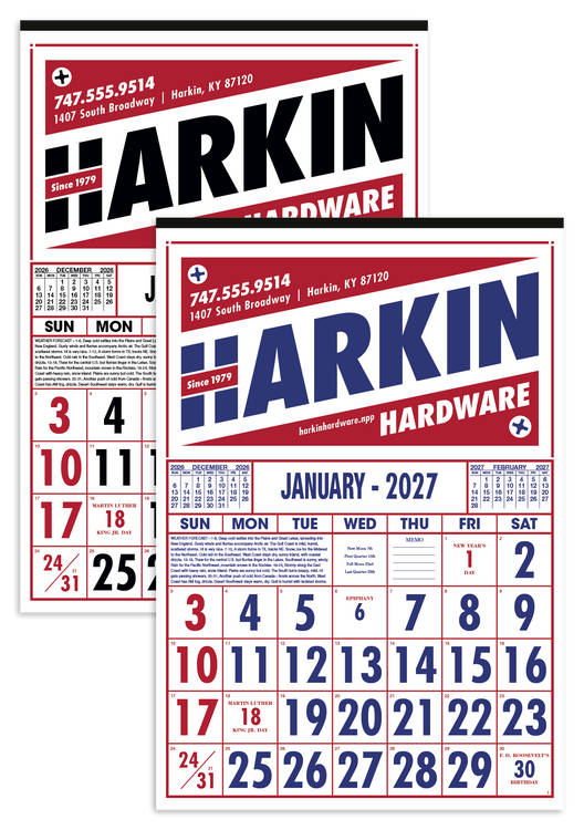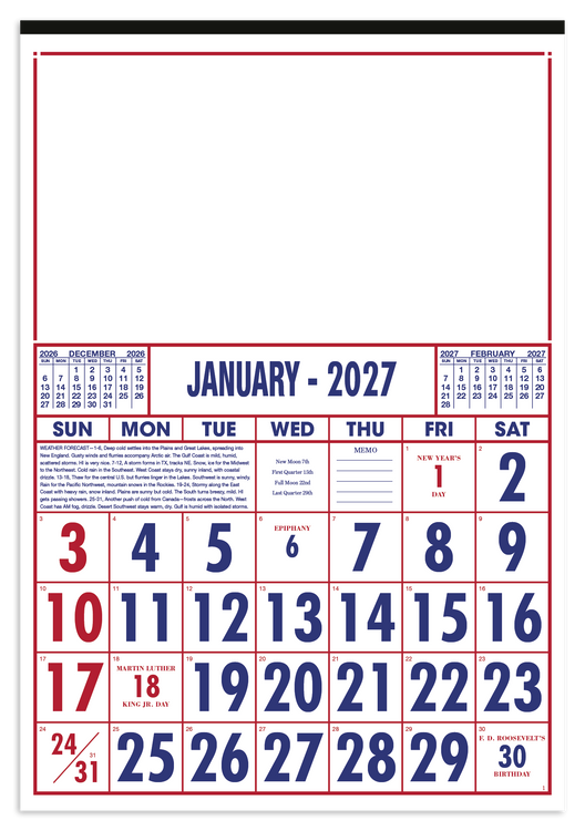 Designed for practicality and style, this commercial calendar features large, high-visibility numbers for easy readability at a glance. Previous and upcoming months are displayed for quick reference and special graphics draw attention to important observances. The SFI® label means that materials used for this product have been responsibly sourced. Additional decoration charges may apply.