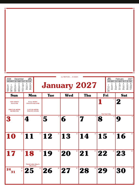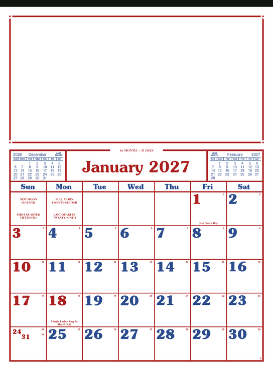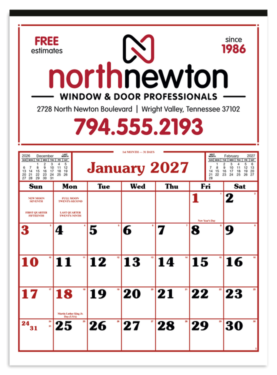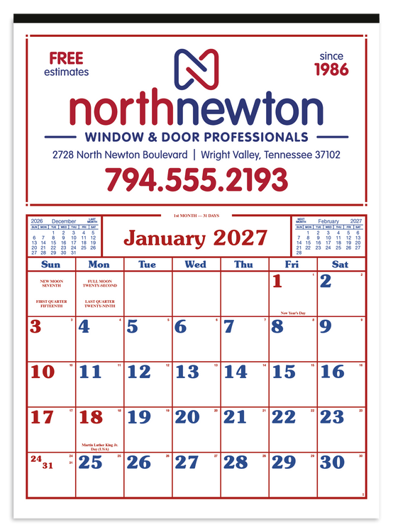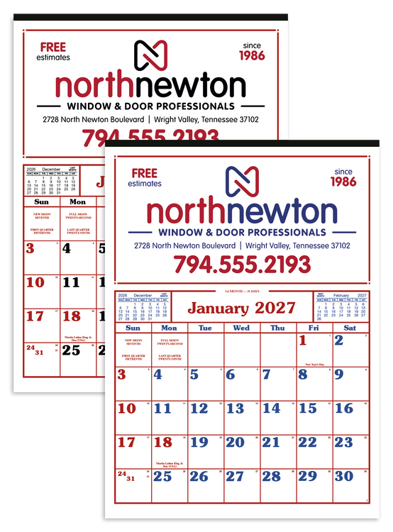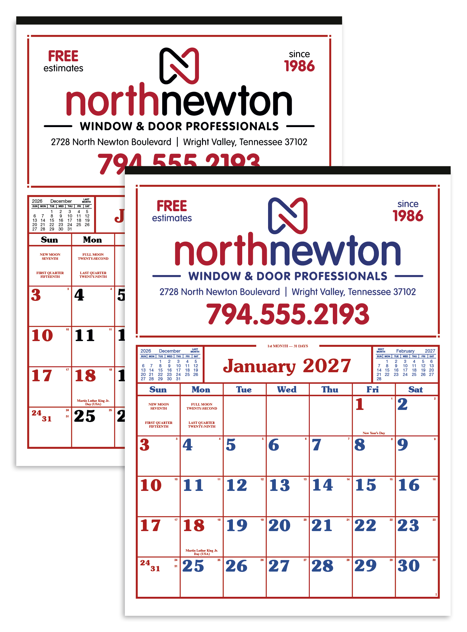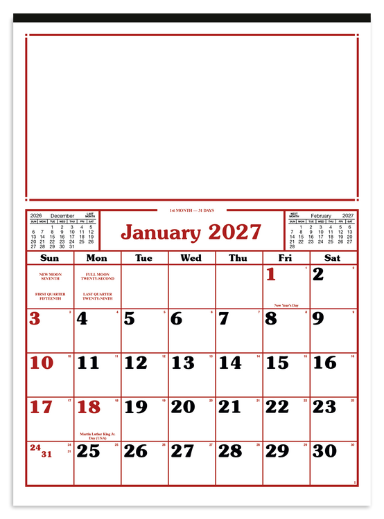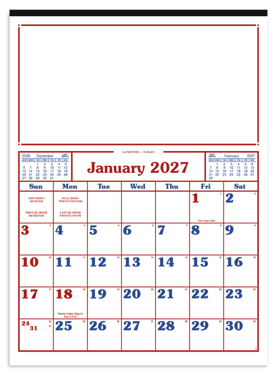 Keep track of the date at a glance with this large-format 12-sheet commercial calendar. The bold numbers and clear layout make it easy to stay organized, while the previous and upcoming months provide convenient reference. The SFI® label means that materials used for this product have been responsibly sourced. Additional decoration charges may apply.