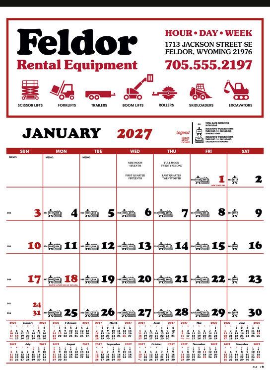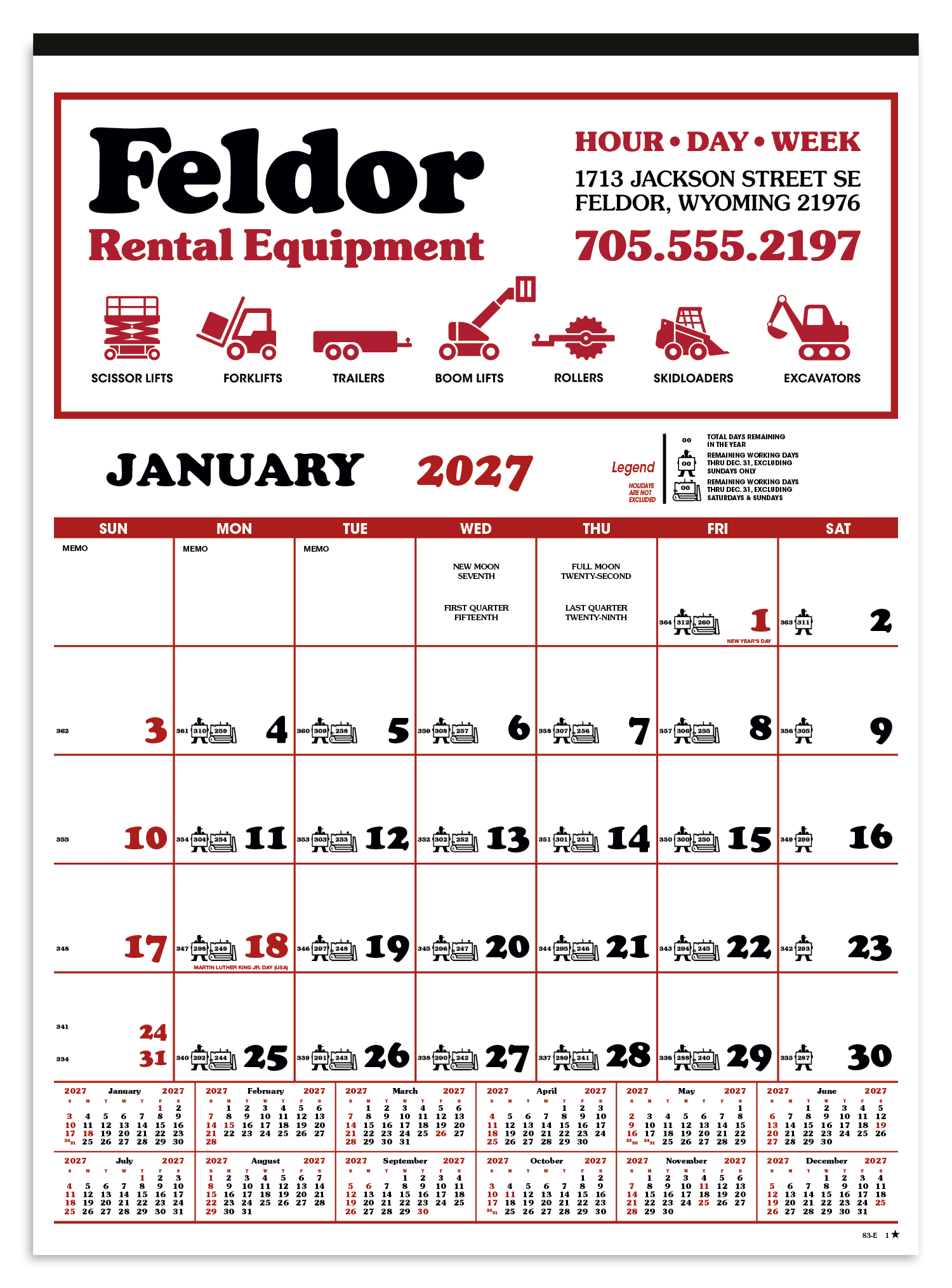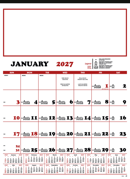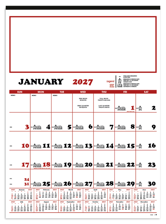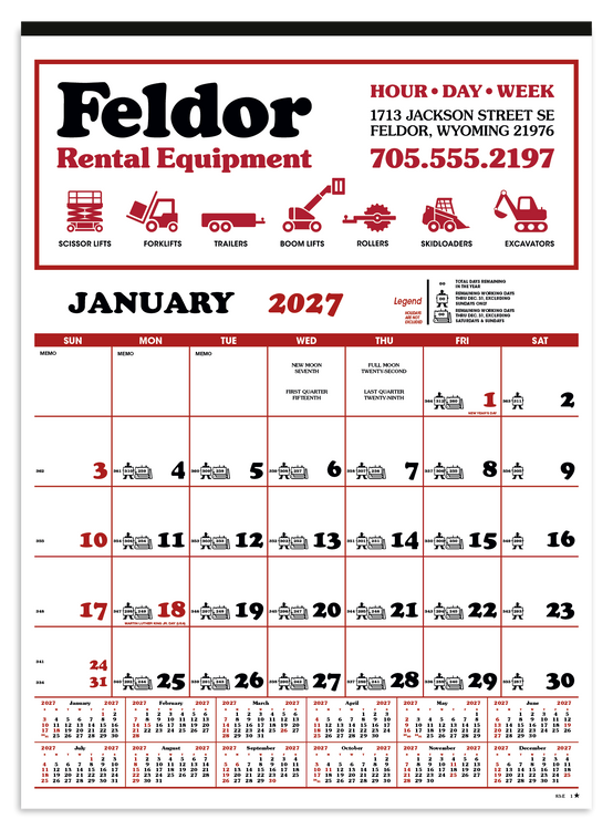 This large 12-sheet contractor calendar offers a clear, easy-to-read layout, making it a practical choice for busy workplaces. A full-year calendar is displayed at the bottom of each page for quick reference, along with workdays remaining in the year (excluding weekends) and days remaining without Sundays. The SFI® label means that materials used for this product have been responsibly sourced. Additional decoration charges may apply.