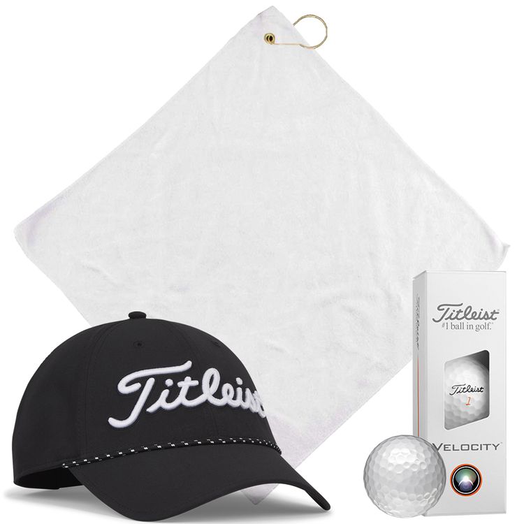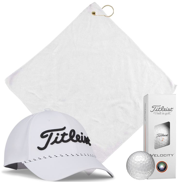 The Titleist Breezer golf kit is sure to turn heads on the course. This kit features the Titleist Breezer Hat, showcasing the classic Titleist script across the front and a stretch clasp closure. The hat is UV-treated for sun protection with a 50+ UPF rating. The kit also includes three Titleist Velocity golf balls and a 16"x 16" white microfiber golf towel. A perfect combination of style, function, all while co-branding with the #1 brand in golf.